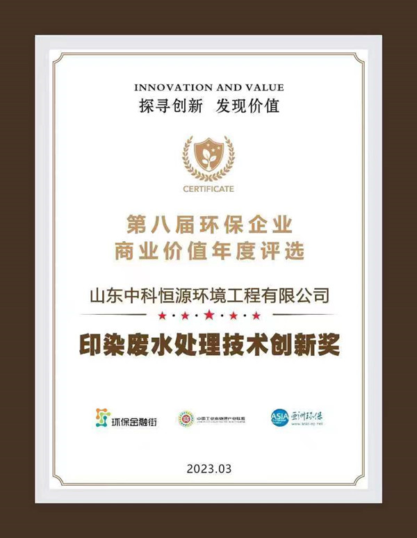 中科恒源获得由环保金融街、中国工业水处理产业联盟、亚洲环保媒体平台联合颁发的“印染废水处理技术创新奖”